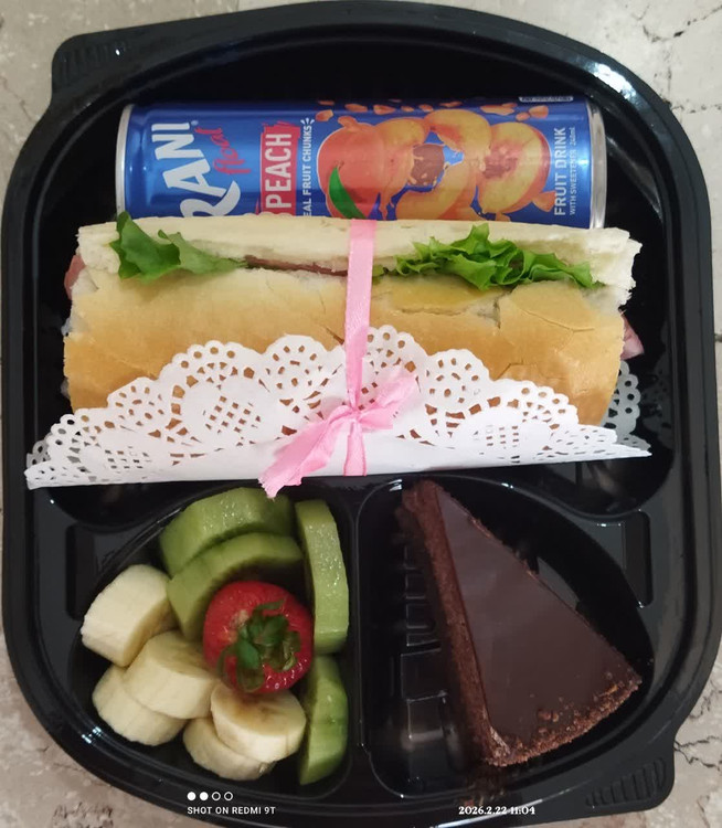 پک تولد لاکچری دارای یک عدد مینی ساندویچ و یک عدد کیک خانگی مثلثی،آبمیوه قوطی و سه مدل میوه خرد شده به انتخاب مشتری💐